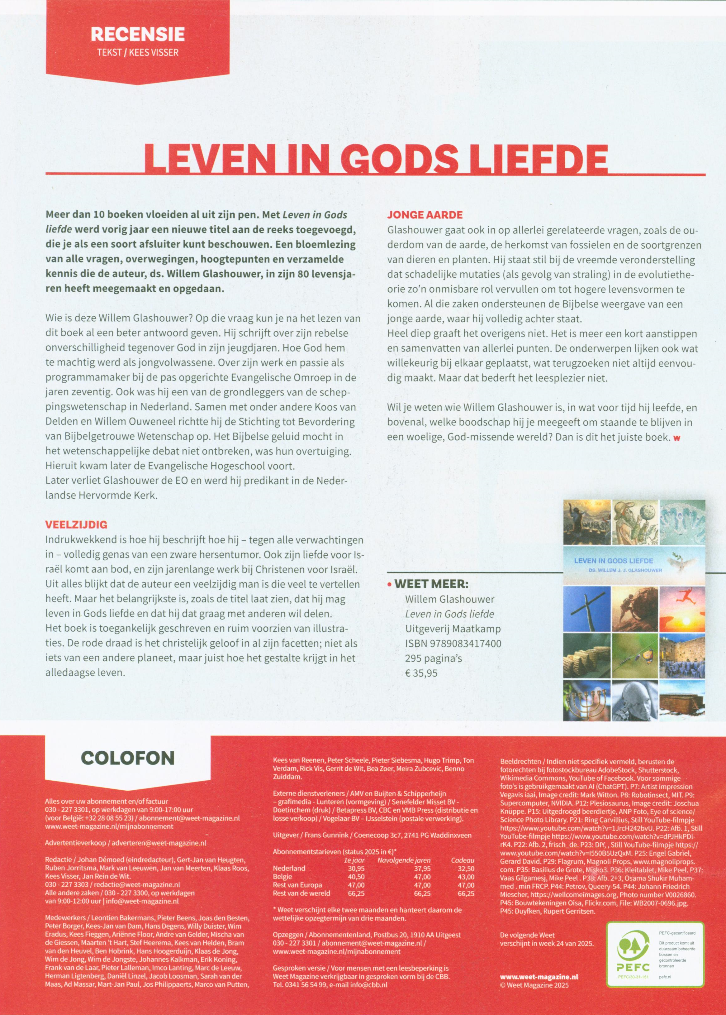 Meer dan tien boeken vloeiden al uit zijn pen. Met Leven in Gods liefde werd vorig jaar een nieuwe titel aan de reeks toegevoegd, die je als een soort afsluiter kunt beschouwen. Een bloemlezing van alle vragen, overwegingen, hoogtepunten en verzamelde kennis die de auteur, ds. Willem Glashouwer, in zijn 80 levensjaren heeft meegemaakt en opgedaan. Wie is deze Willem Glashouwer? Op die vraag kun je na het lezen van dit boek al een beter antwoord geven. Hij schrijft over zijn rebelse onverschilligheid tegenover God in zijn jeugdjaren. Hoe God hem te machtig werd als jongvolwassene. Over zijn werk en passie als programmamaker bij de pas opgerichte Evangelische Omroep in de jaren zeventig. Ook was hij een van de grondleggers van de scheppingswetenschap in Nederland. Samen met onder andere Koos van Delden en Willem Ouweneel richtte hij de Stichting tot Bevordering van Bijbelgetrouwe Wetenschap op. Het Bijbelse geluid mocht in het wetenschappelijke debat niet ontbreken, was hun overtuiging. Hieruit kwam later de Evangelische Hogeschool voort. Later verliet Glashouwer de EO en werd hij predikant in de Nederlandse Hervormde Kerk.